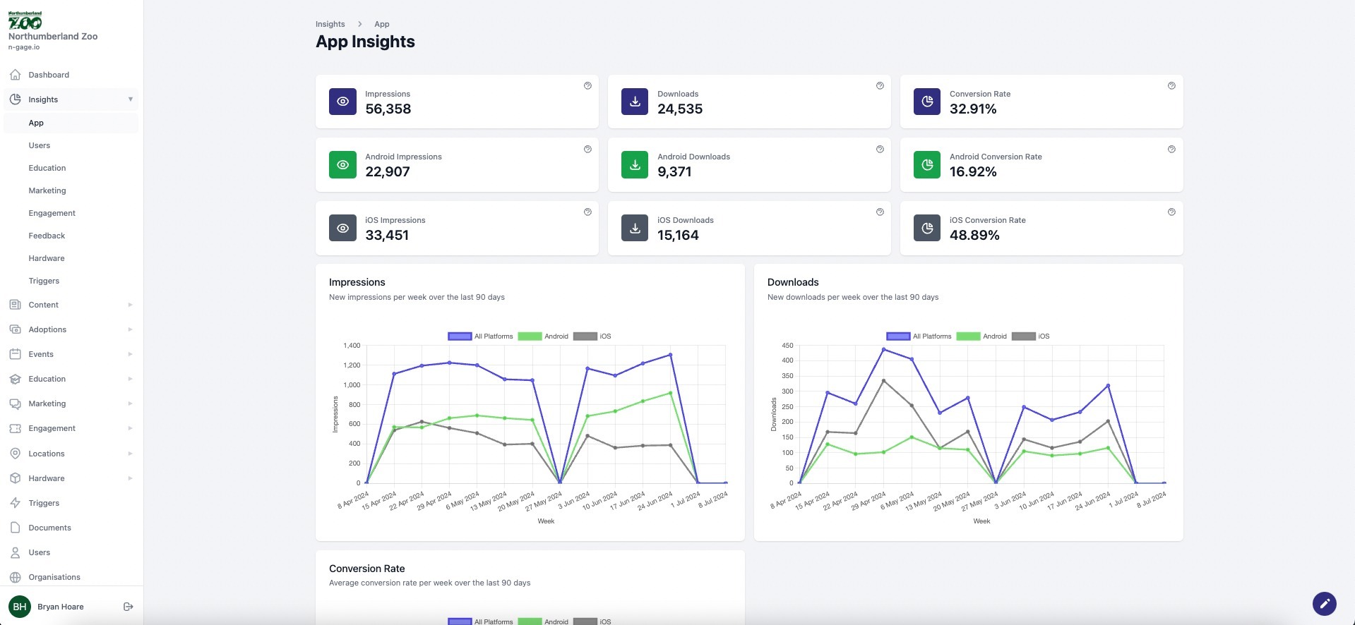 - The app insights screen provides data on the number of impressions and app downloads from the App Store and Google Play.