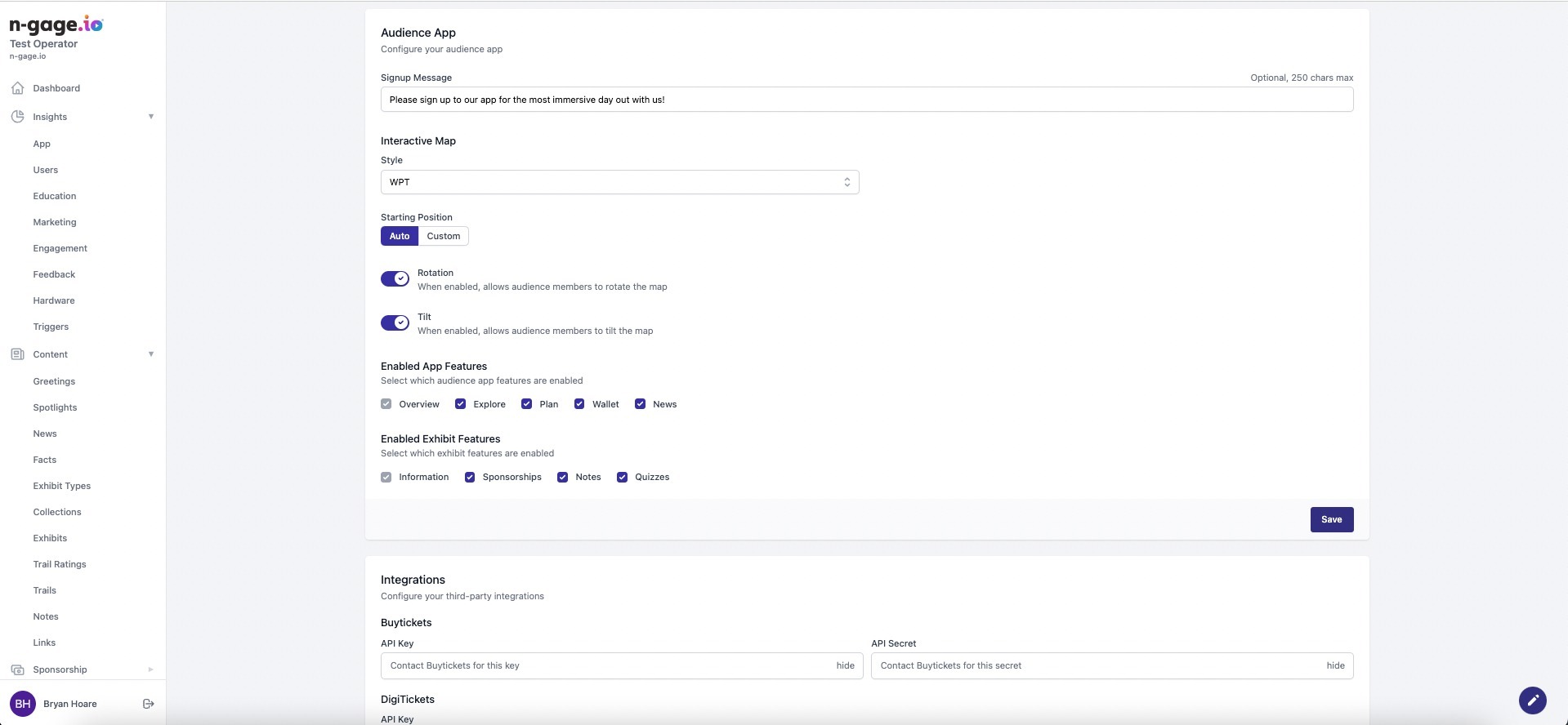 - Operators are given with the ability to toggle exhibit features present within the audience app, the currently available features to toggle on/off are sponsorships, notes and quizzes.