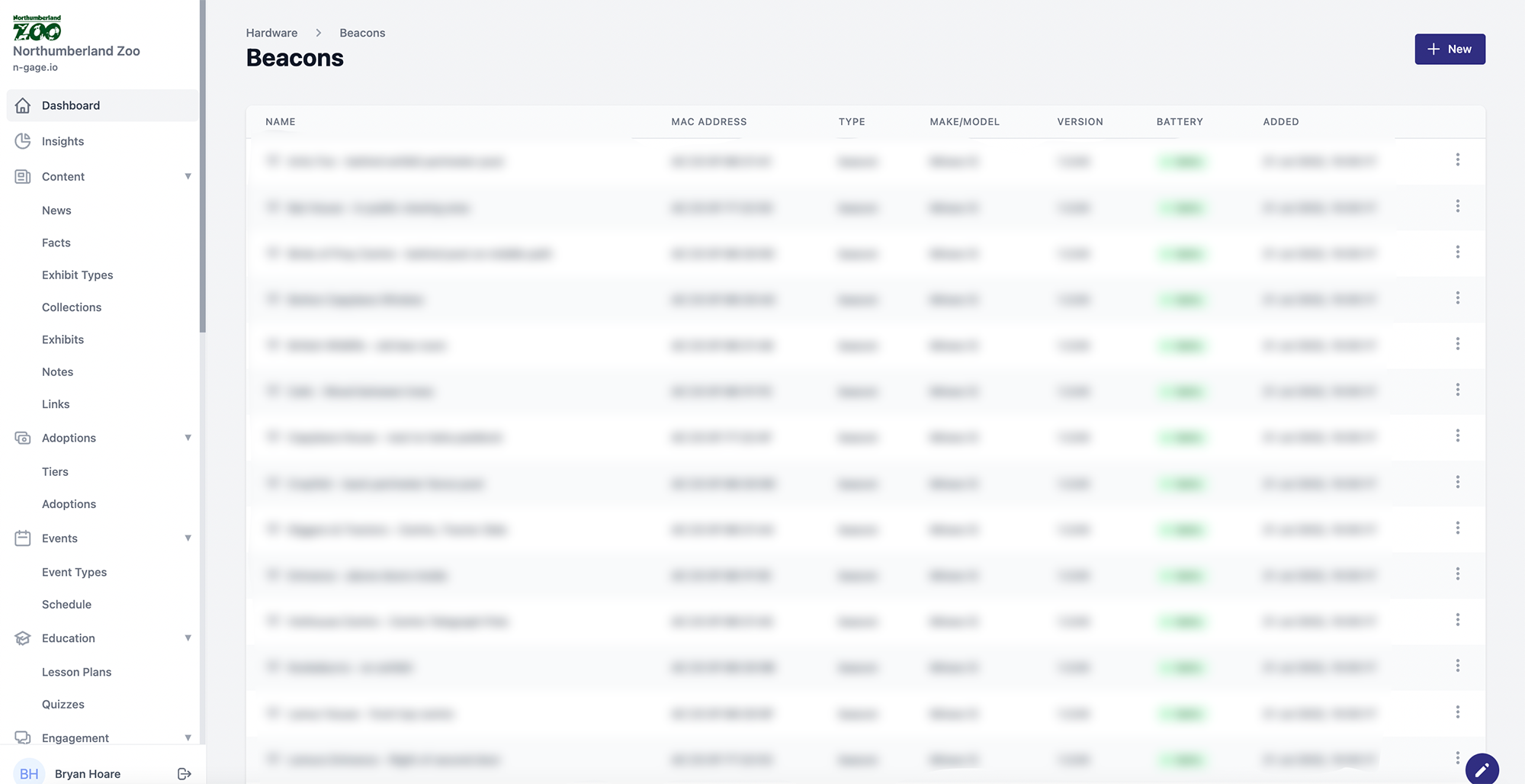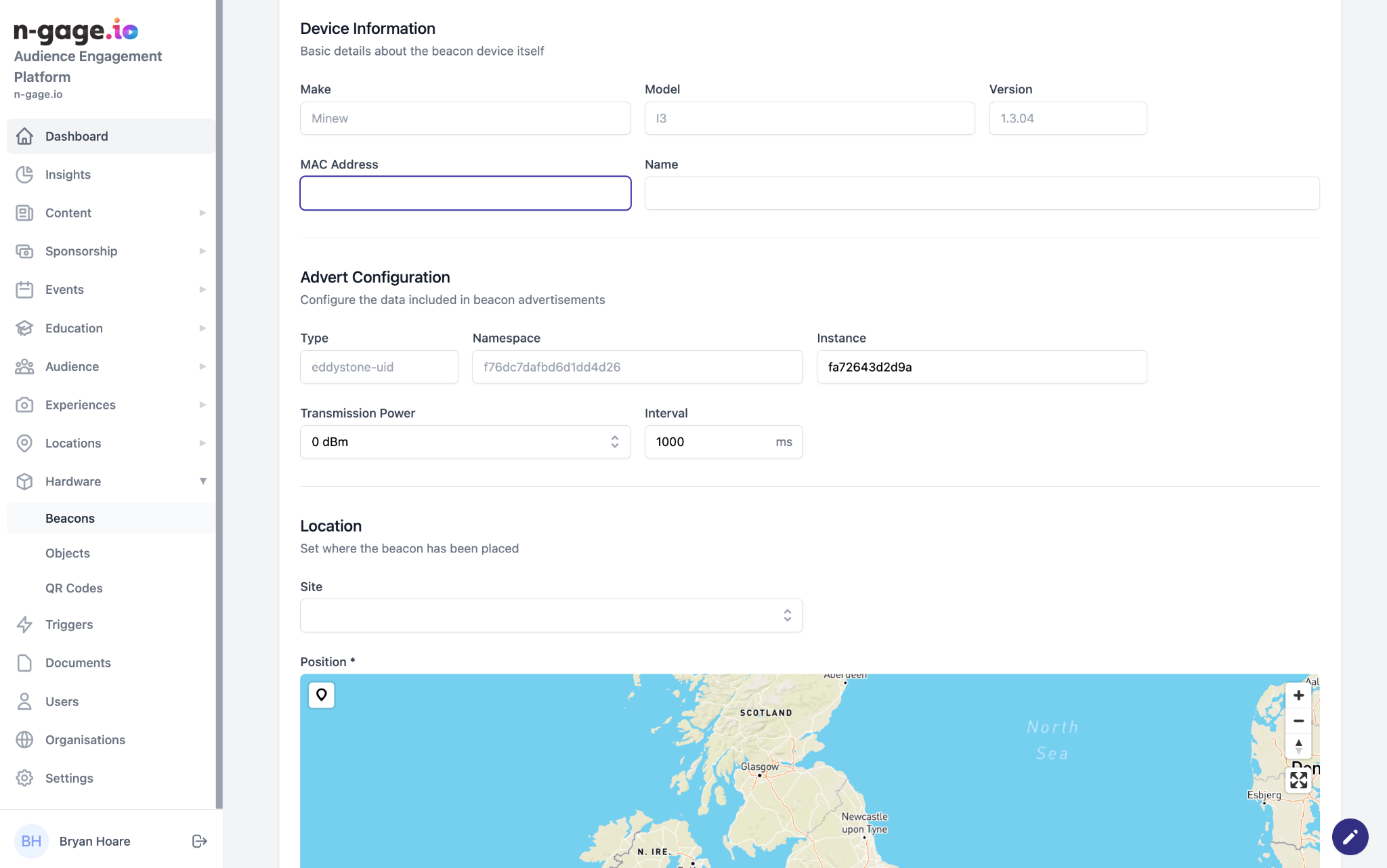 Add Bluetooth beacons by MAC address and map position. Configure adverts, battery, and status. Beacons track visitor dwell times and enable triggers.
