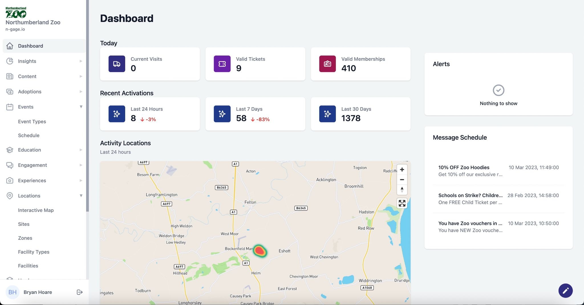- The dashboard provides basic KPI data in relation to audience engagement as well as a heatmap of all activations onsite and any alerts or scheduled messages.