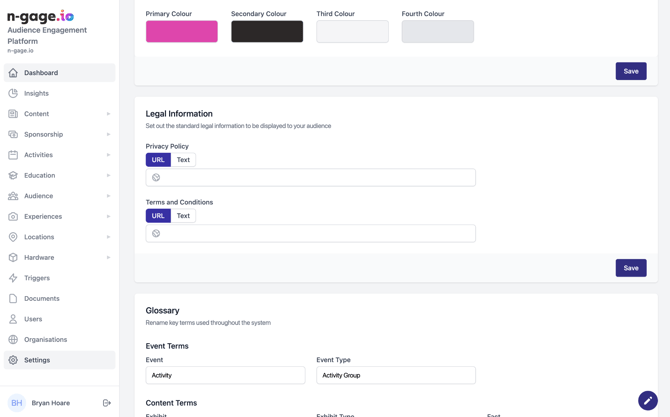- Add standard legal information such as a Privacy Policy and Terms and Conditions. This is important and legally required. The n-gage.io team will provide guidance in this area as part of the onboarding programme.