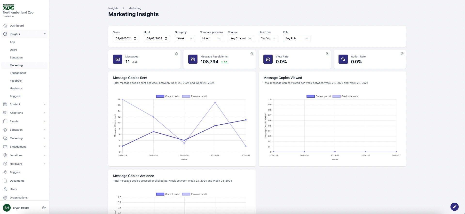 - The marketing insights screen provides real-time feedback on push notification and email marketing activity.