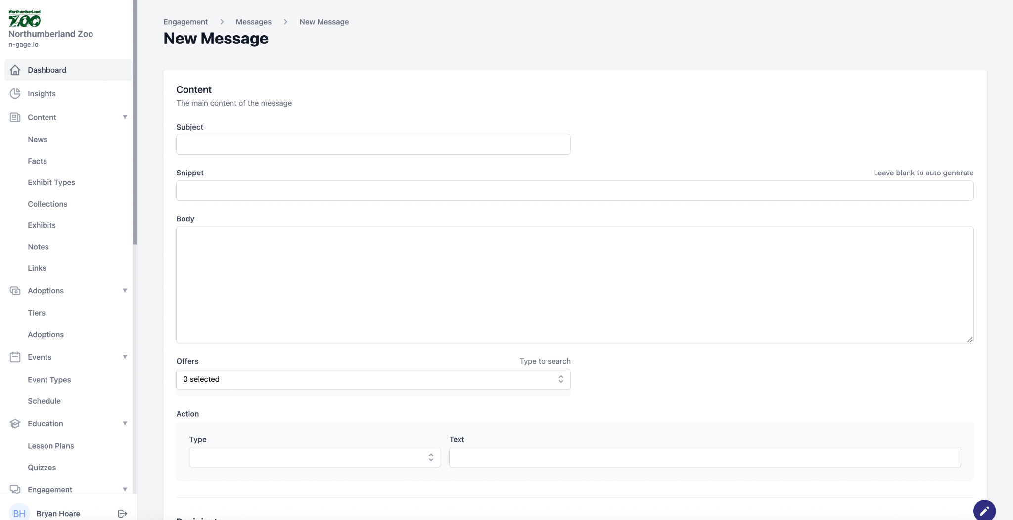 - To create a message, add a subject and a message snippet - the snippet will appear in the push notification text so keep it short. Add body copy and choose a previously created offer to attach to the message.