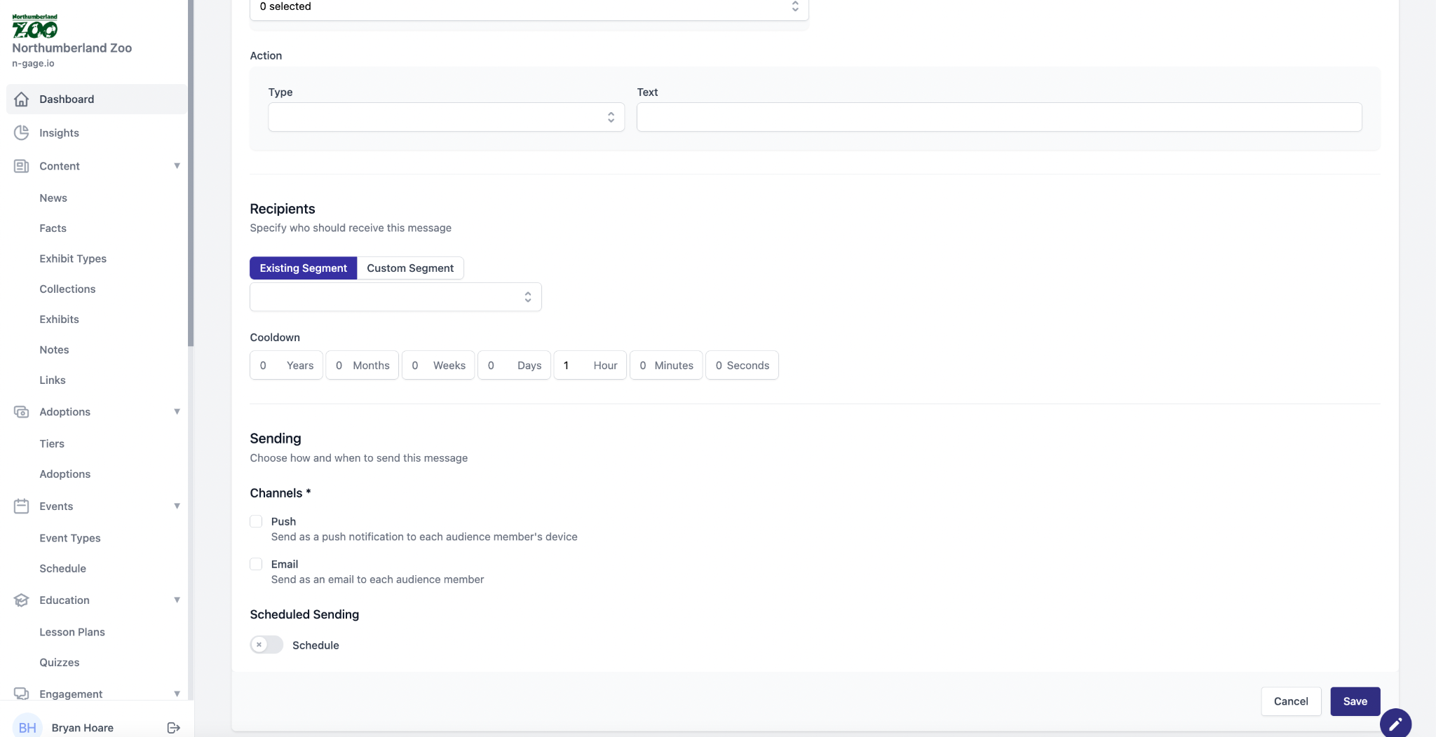 - Messages can be given a cooldown period which helps to prevent audience members receiving the same message repeatedly if they continue to fit the chosen audience segment. This is a particularly useful function when combined with the trigger feature to enable only the targeting of additional new audience members with a repeating message. Choose how and when to send the message with options for push notification, email or both.