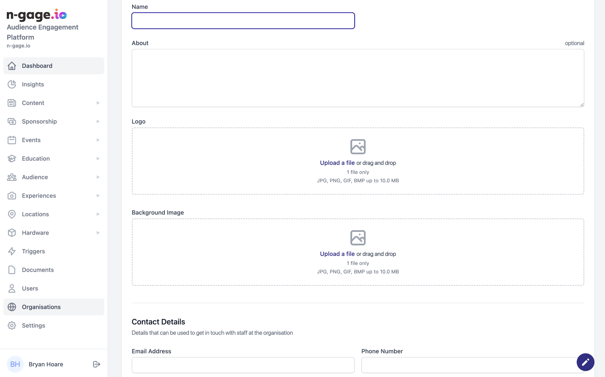 - To create a new organisation, add their name, details about them, a brand logo and background image. An external URL link for a website can also be added.