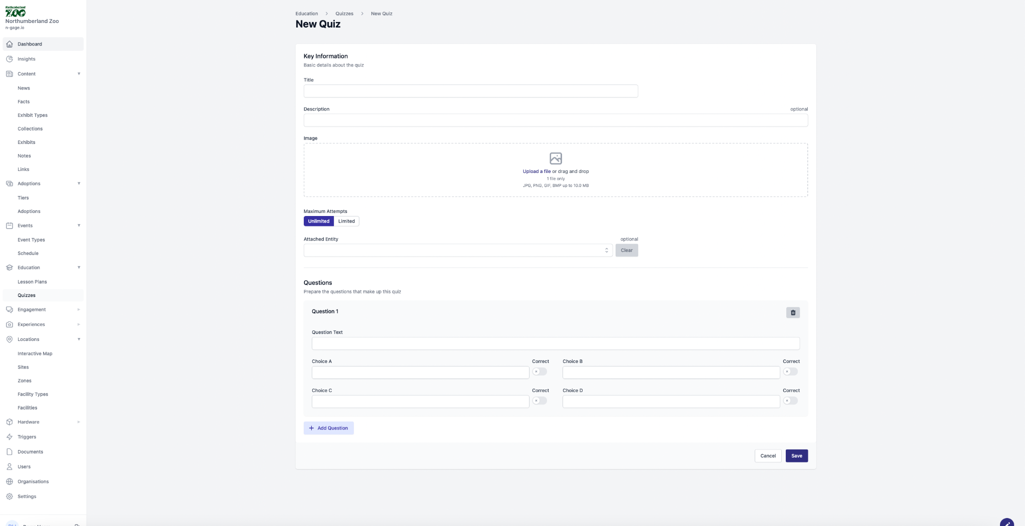 - To create a quiz, provide a title, short description and add a media file image to be displayed in-app. Choose the number of attempts allowed, and attach the quiz to an exhibit entity already added.